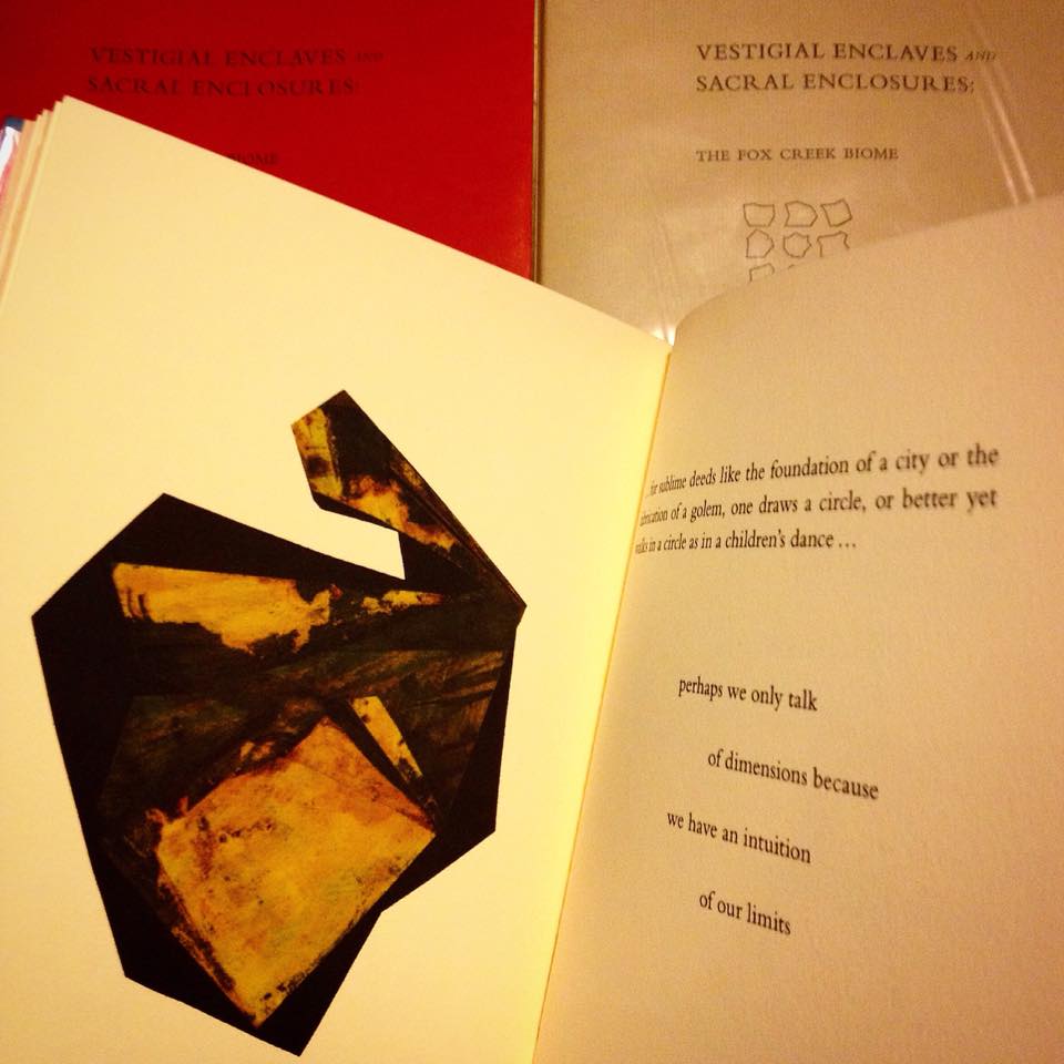 Photo of Leon Johnson’s limited edition book, Vestigial Enclaves and Sacral Enclosures, which includes a new commissioned poem by Bill Harris, almanac notes by Norman Douglas, photography by Leander Johnson, a commissioned composition by Joel Peterson (also performed live), six maps by Paul Bartow, and six new works by Johnson. Designed, typeset and printed by Megan O’Connell for Salt and Cedar. Handbound by Johnson.