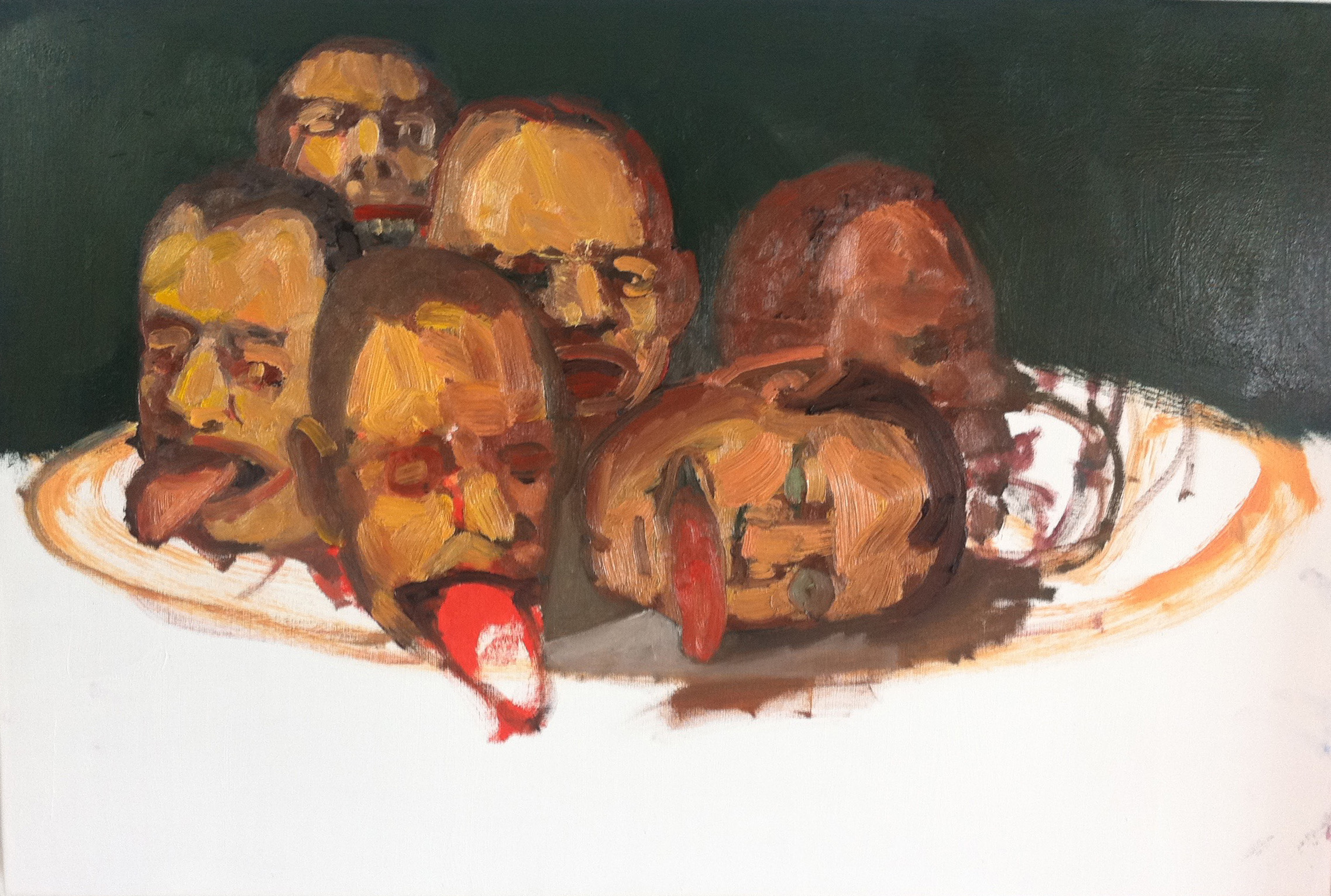 Almost every head in this picture lives in another painting at this point.  It’s been a series of migrations.  They came in one picture and moved into another one.  It makes sense to me that I couldn’t finish banquet because it was never meant to be a painting – it was meant to be a site of possibility that led to other paintings.